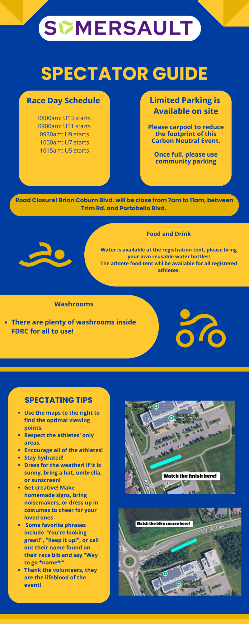 Une aide extérieure est autorisée ! Les parents peuvent aider leurs enfants avec des choses comme la préparation de l'équipement et les transitions. Aucun parent ou spectateur ne sera autorisé sur le podium de la piscine, et vous ne pouvez pas rouler sur le parcours avec les participants, mais dans l'ensemble, nous espérons voir tout le monde s'impliquer.